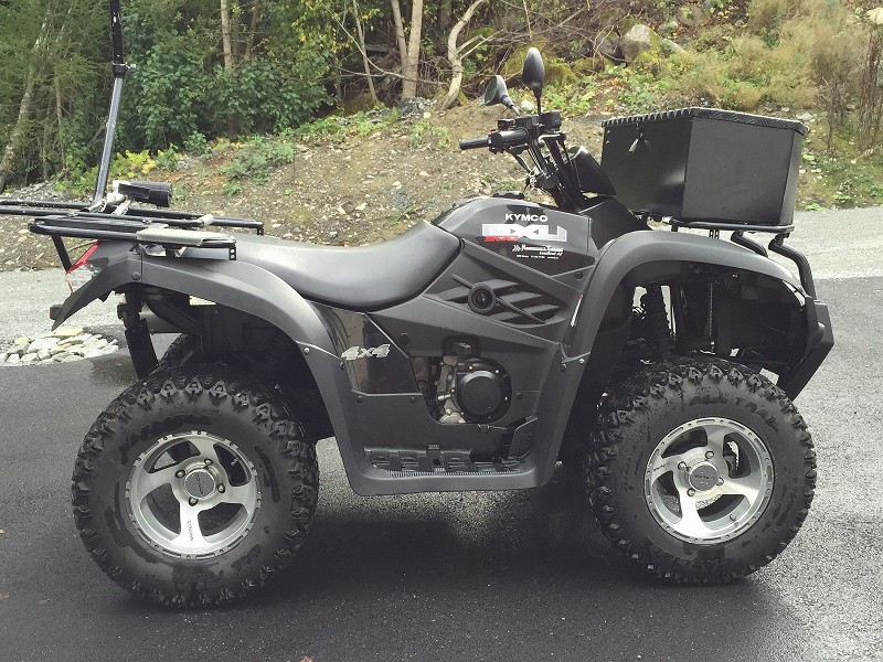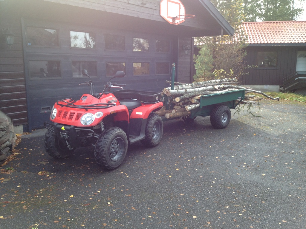 ATV 2: føreste Arctic Cat, 366/400 2009, MC-reg, er produsert av Kymco derfor er de så like. Kjøpt i Stavanger, hentet med henger da jeg var på jobb der nede. Brukt til snøbrøyting heime og vedkjøring på hytta. Fungerte helt OK forholdsvis liten men stor nok til bruket da, savnet sperre foran når brøytet snø så når en forhandler ville ha den i innbytte til en pris jeg kunne leve med så var nr 3 et faktum.