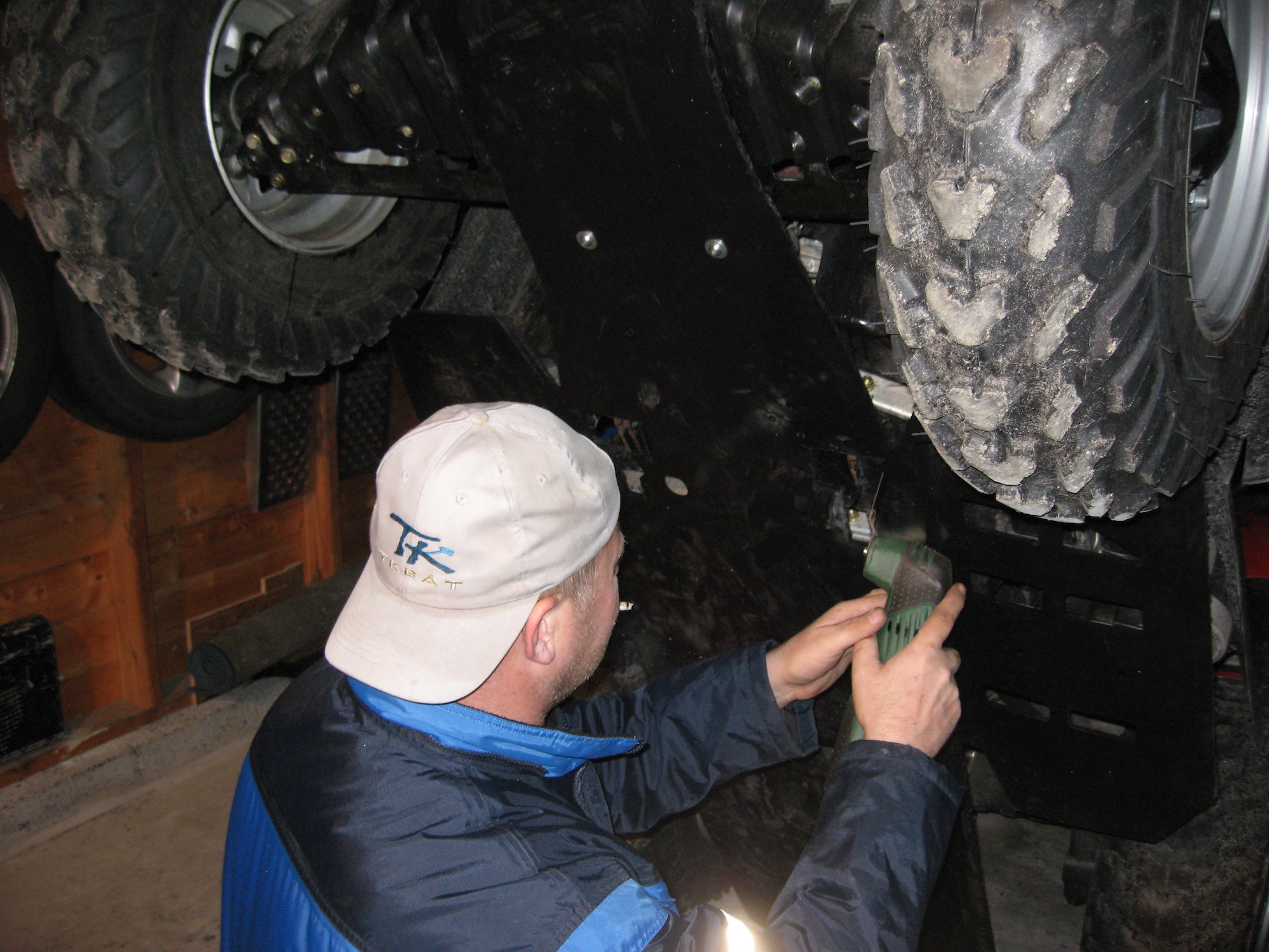 Ellers har jeg smalet inn platen 12cm på hver side bak helt fram til der plasten går under fotbrettet og kuttet den 9 cm kortere ved slepekroken. Vil ikke at det skal samles så mye gjørme og snø på sidene og det utstikket bak slepefestet så jeg for meg kom til å hekte seg fast i alt mulig rart når man rygger i skauen med det som resultat at man røsker hele greia løs. Freset også et svært dreneringshull midt under rett bak bakdiffen siden det ble en liten skåleform der.